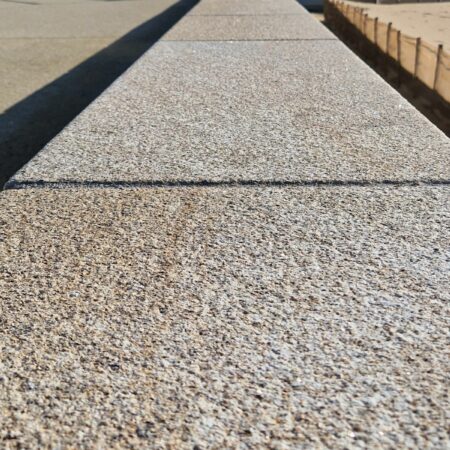 👉 Le choix de la maîtrise d'œuvre s'est orienté vers un granit en harmonie de teintes beige/jaune en finition grenaillée qui se confond parfaitement avec la plage de Pornichet attenante.