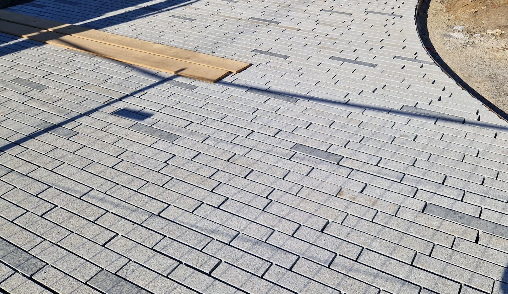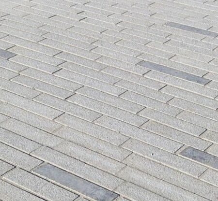 Pour ce faire ils ont sélectionné le granit Azul Platino des carrières DFG Natural Stone, pour sa modernité, et travaillé les dalles en formats allongés pour rappeler les modules en terre cuite. Il a été retenu deux finitions différentes pour mettre la pierre en valeur et apporter du contraste.
